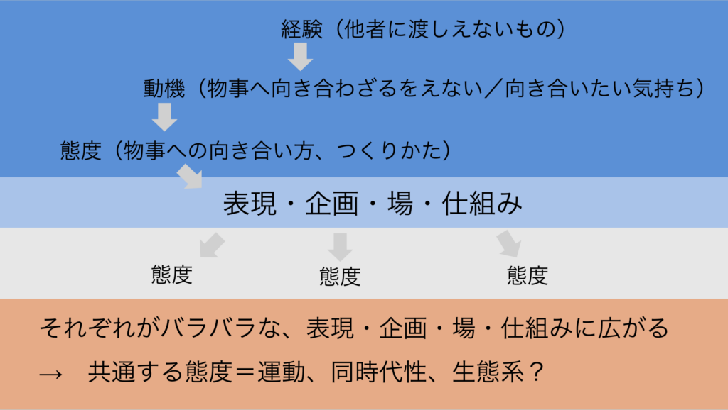 災害のような出来事があり、個々人が「誰にも渡し得ない経験」をもってしまう。その出来事に向き合わざるをえない・向き合いたいという気持ち、つまり「動機」が生じるわけです。そこから出来事への「向き合い方=態度」(作り方・関わり方)が立ち上がる。その結果として、他者と共有可能な表現や企画、場、仕組みが生まれてくる。こう整理ができるんじゃないのかと思っています。