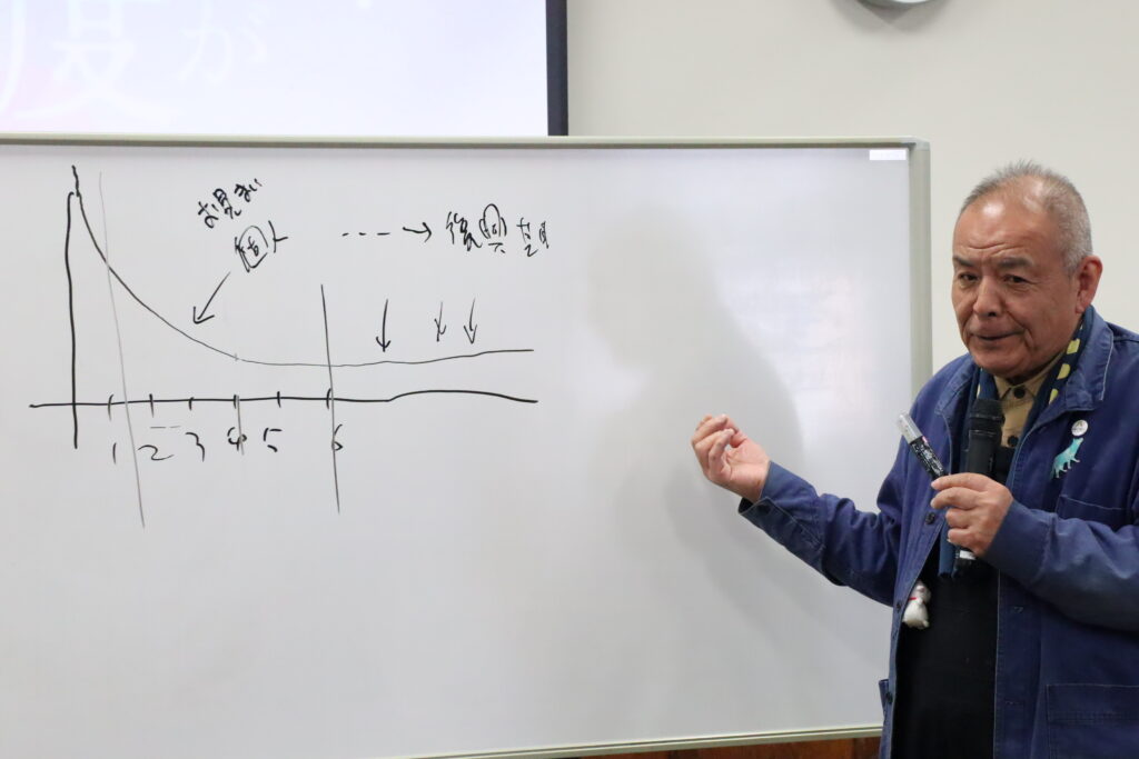 (図を示して)この先、金沢の皆さんはだんだんリアリティーがなくなってきて、 能登のこと刻々と忘れていく。感覚が薄れていく。でも能登の人たちは苦しんでいる。こういう状態。こっちの支援とは違う。それこそ時間軸に対応するような支援にフェーズが移って行くんだけど。ここから先の話は今はつらいのでしなかったです。